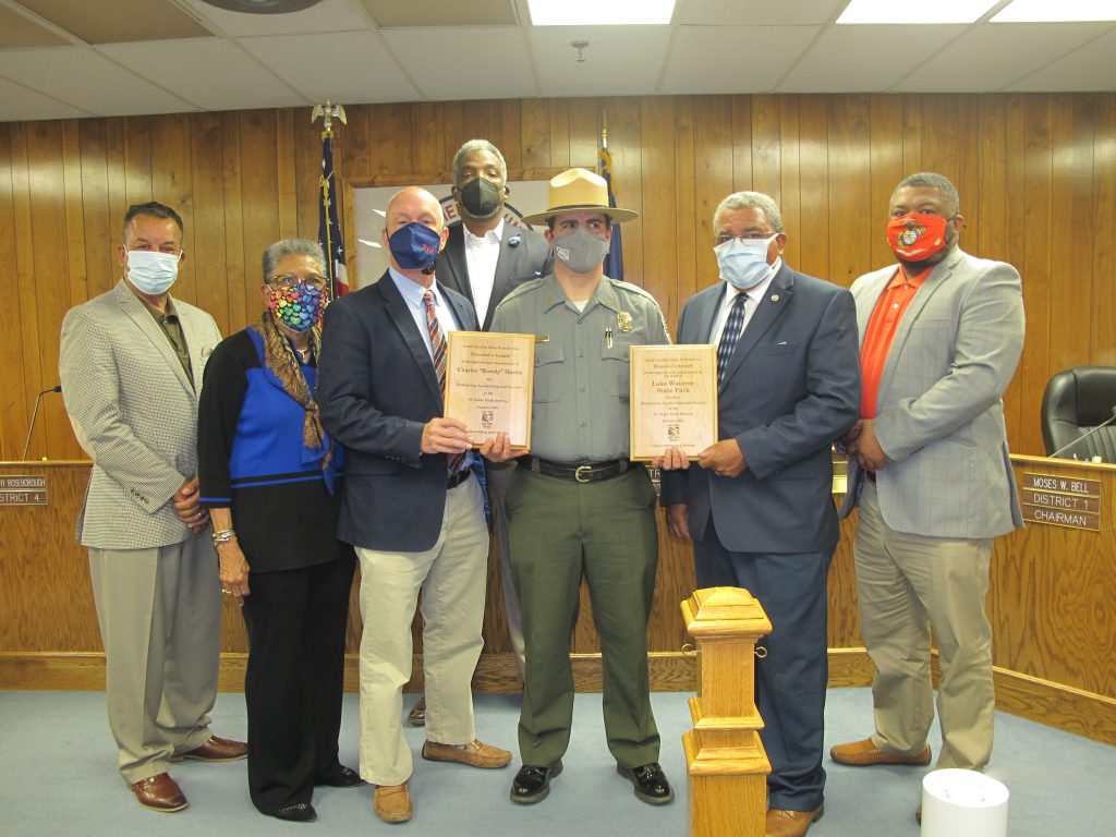 WINNSBORO – Charles ‘Rowdy’ Harris, the Lake Wateree Park Manager, center, is congratulated by members of county council after he received the S.C. State Park Service Director’s Award. The award is presented each year to the park employee who has gone above and beyond. Harris has managed a new campground and new challenges associated with that as well as always being ready and willing to help his region’s chief.