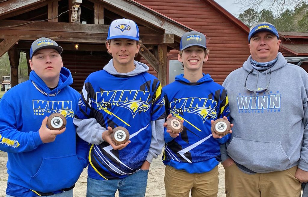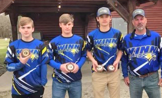 Pictured above, Eagle team of Ben Clowney, Connor Little and Miller Stuck, with coach David Stuck, placed second in JV Advanced in last weekend’s competition. Stuck had third highest overall average. Below, JT Wilkes, Aaron Geddens and Charlie Bonds, coached by Randy Wilkes, placed first in Intermediate. Bonds had the highest overall average.