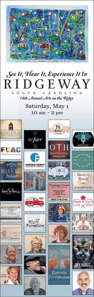 Event and merchant sponsors include: Town of Ridgeway, ByFarr Designs, Pig on the Ridge, Write On SC, Fairfield County Arts Council, Fairfield County Chamber of Commerce, Olde Town Hall Restaurant, The Ivy Veranda, Bella & Blue Boutique, Palmer Street Market, The Cotton Yard Market, Laura’s Tea Room, Grandma’s Attic, Slightly North of Charleston, Sarah & Geo’s Pizza, Bows & Ties Pet Grooming, and Vintage Event. Mary Chadwell’s ‘Ridgeway’ book will be on sale at Ruff Hardware and Ruff Furniture.