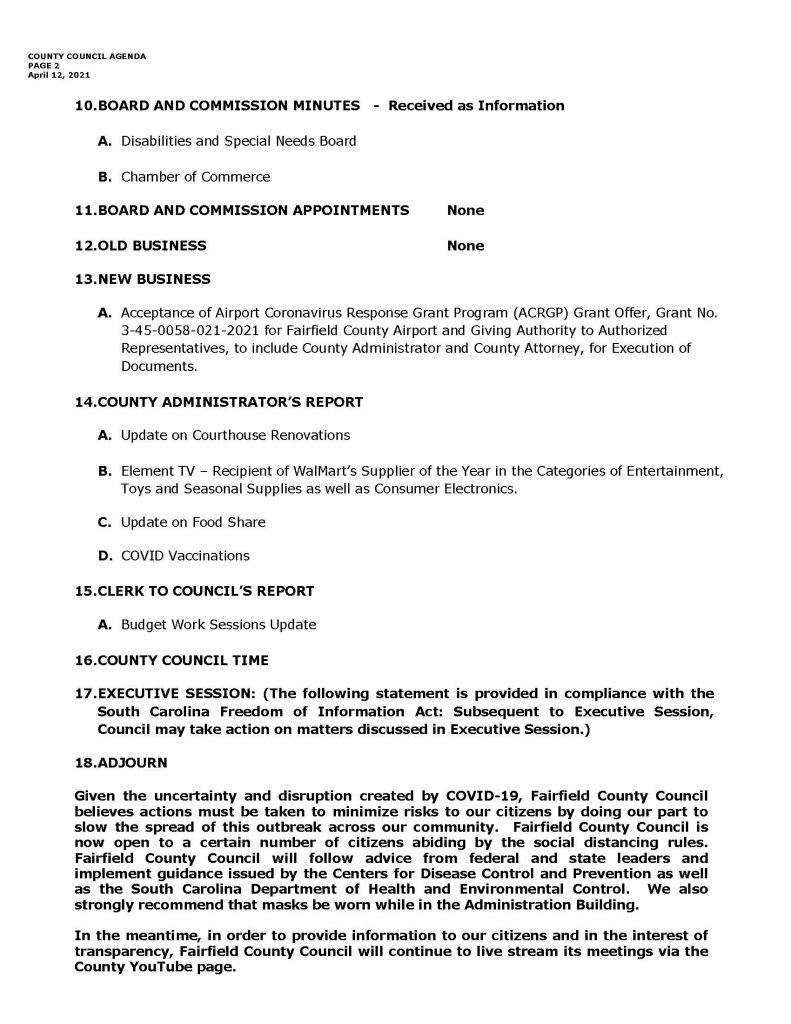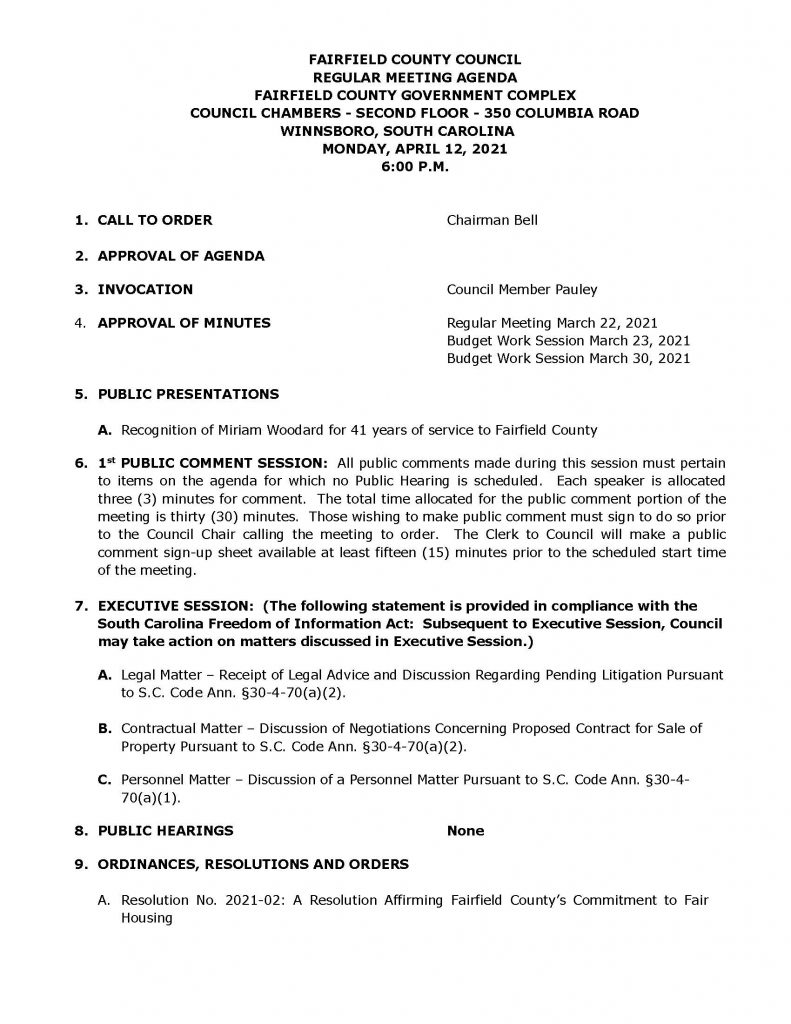 Tonight’s regular meeting is held at 6:00 in Council Chambers on the second floor at the Fairfield County Government Complex, 350 Columbia Road, Winnsboro.