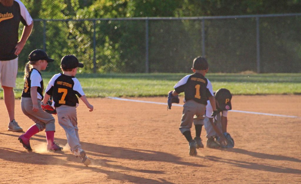 Pictured above, the Angels took on the White Sox in the machine pitch league. Below, t-ball players from the Pirates team go for a ground ball.