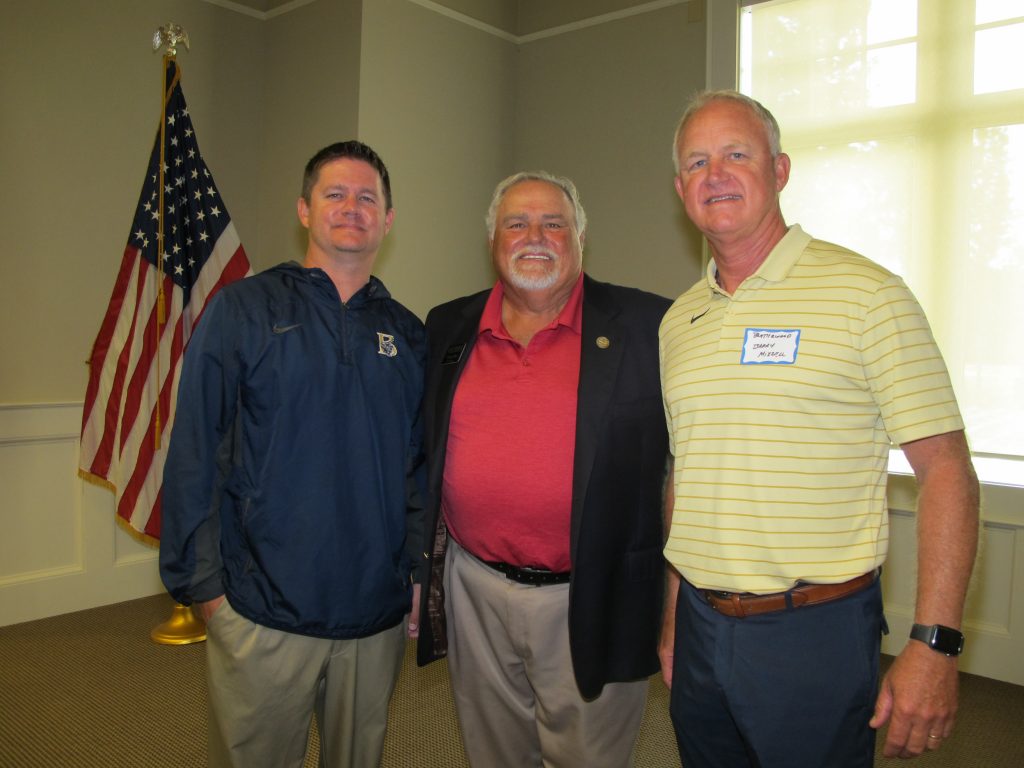 BLYTHEWOOD – The Blythewood Chamber of Commerce held its annual Battle of the Woods coaches’ football season preview at its monthly breakfast meeting Tuesday morning minus Westwood Head Football Coach Matt Quinn and Athletic Director Coach Jason Powell, who were unable to attend.  The program featured Blythewood High School Head Football Coach Jason Sidel, left, and the school’s Athletic Director Barry Mizzell. Chamber chairman Mike Ross, center, said Coach Quinn will be invited to preview Westwood’s football season at the September Chamber meeting.