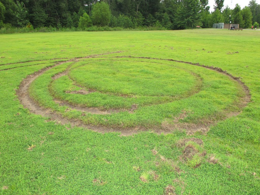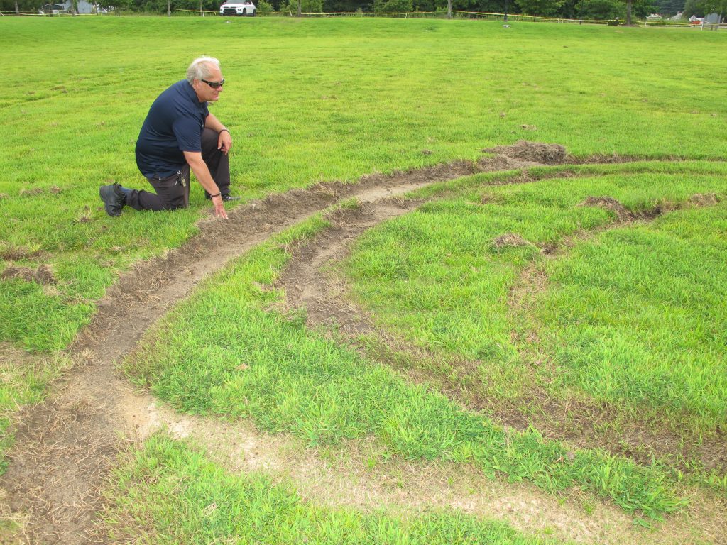 During Monday night’s town council meeting Mayor Bryan Franklin announced that the park was struck again over the weekend by vandals who dug deep ruts in the grass, making 20- to 30-foot diameter ‘donut’ circles into the park’s large athletic field on the McLean Road side of the park.