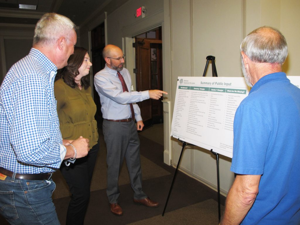 “At that point,” Sprouse told the audience, “We want to get your input,” he said, pointing to boards on easels along the back of the room. “Those boards are for you to write on and put sticky notes on with your ideas and suggestions.” Sprouse, who is helping guide the town’s planning commission in the updating of the comprehensive plan, said, “We’re looking for specific input, that will help us track where things are headed.”