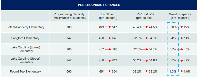 The impacted schools are Bethel-Hanberry Elementary, Langford Elementary and Lake Carolina Elementary Lower and Upper Campus. Round Top Elementary attendance lines will change but there will be no changes in the number of students attending the school.