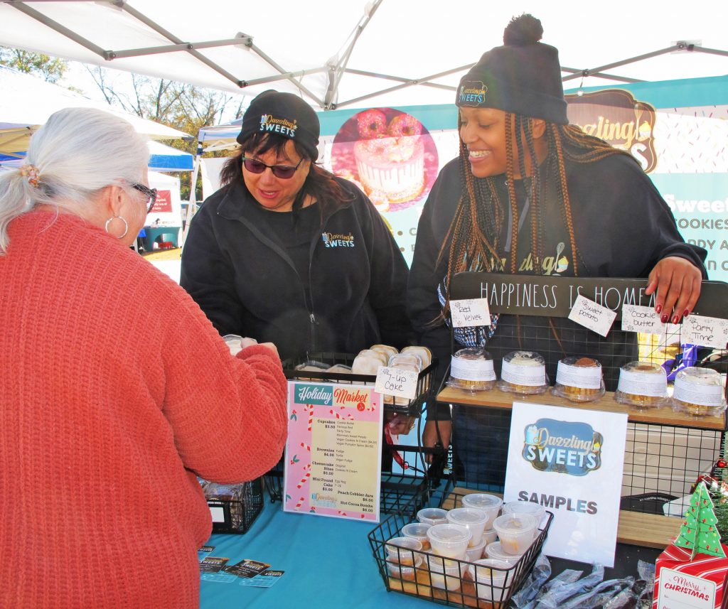 Vickie and Renee Woodard brought their Dazzling Sweets booth. Kevin and Connie Benson stroll with their toddler Captain.