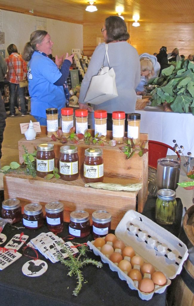 Toddler Hazel Wilkes purchases four lemon cookies from vendor Katherine Bass.