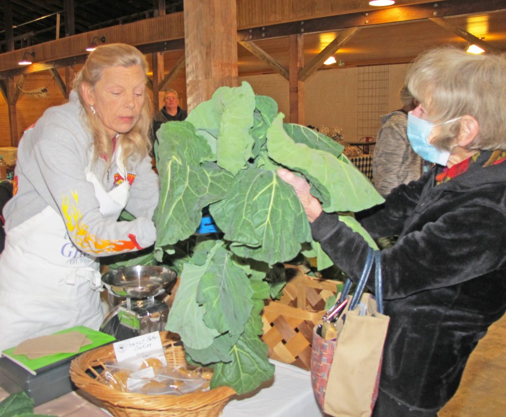 Customer Sandy James, right, selects fresh collards.