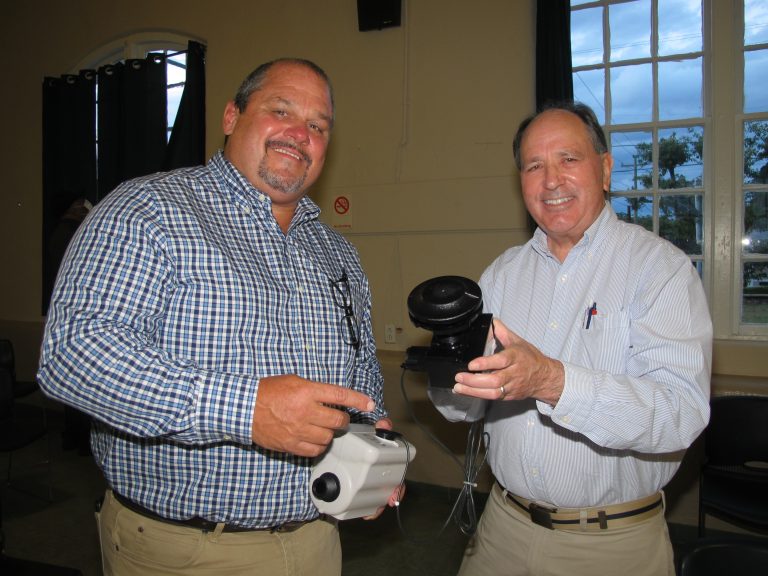 Ferguson Waterworks representative Rob Watson, left. explains to Winnsboro Mayor John McMeekin at a town council meeting how the data from new smart meters, which Watson is holding, is transmitted every hour via a transmitter (held by McMeekin), to an antenna on a water tower and then to the town’s billing office. | Barbara Ball