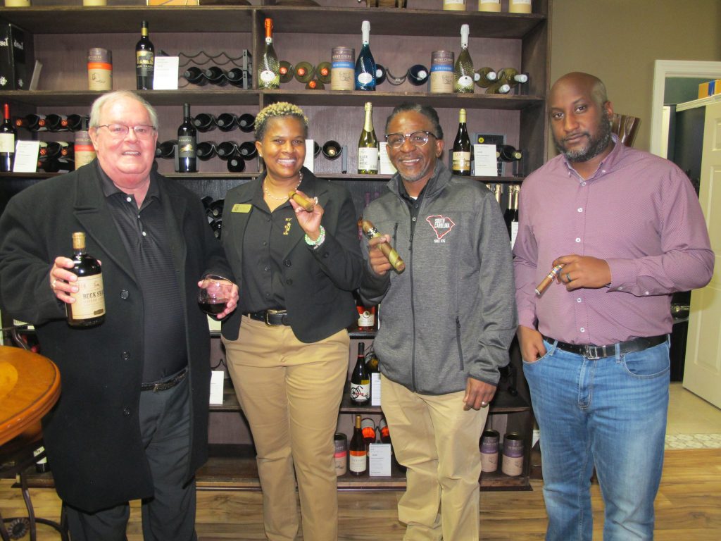 BLYTHEWOOD – Cutting the ribbon during an After Five event to celebrate Blythewood Cigar and Wine are, from left: Phil Frye, director of the Blythewood Chamber of Commerce; Town Councilman Sloan Griffin; co-owner John Edwards, Mayor Bryan Franklin, co-owner Teresa Edwards, Chamber board member Alan George and Town Councilman Donald Brock.