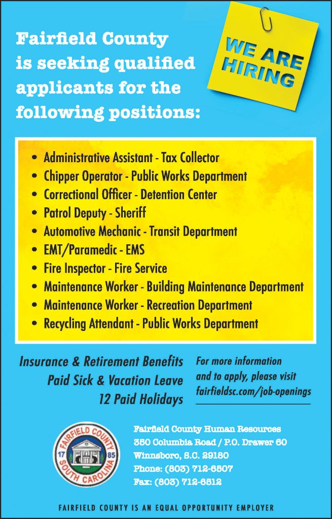 For more information about job openings or to apply, he suggested visiting fairfieldsc.com/job openings or calling 803-718-6507.