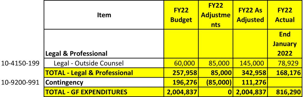 The amendment increases the current $60,000 budgeted amount by $85,000 to $145,000 with the majority of it earmarked for the MPA Strategies’ lawsuit against the Town and the Town’s countersuit. As of the end of January, the Town had spent $78,929.