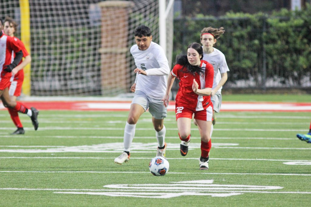 BLYTHEWOOD – Not only did Westwood soccer pick up a win over White Knoll last Thursday, a goal by senior Kaylee Damsen made school history. Damsen scored Westwood’s first ever female goal on a boys team, and she did it within the first 15 seconds of the game.