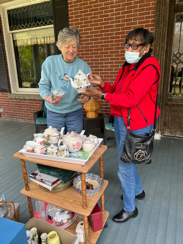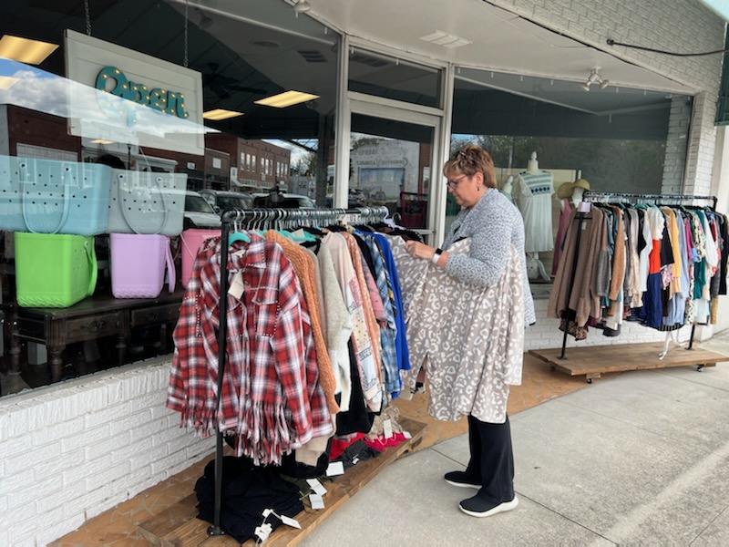 During Saturday’s Sale-A-Brations in Ridgeway and Winnsboro, shoppers braved cold windy weather to find bargains. Pictured above and below, two Blythewood shoppers make choices – Dawn Loner (above) shops the sidewalk at To Be Stitched and Miss VII finds the perfect teapot at Susan Yenner’ Songbird Manor bed and breakfast.