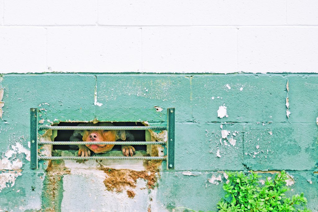 One of the shelter’s pit bull guests scrambles up to look out of a barred ‘window’ in the wall of the shelter’s intake building, referred to by staff as the dungeon.