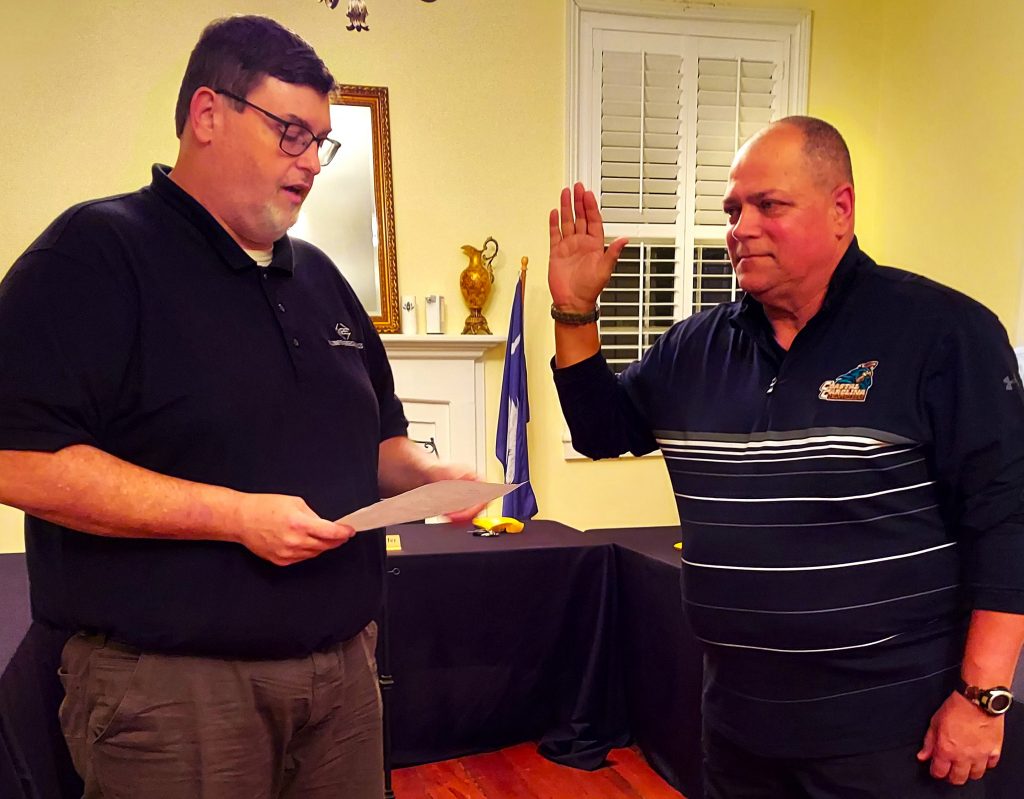 Mayor Heath Cookendorfer, left, swears in Richard Wayne Scrybak.
