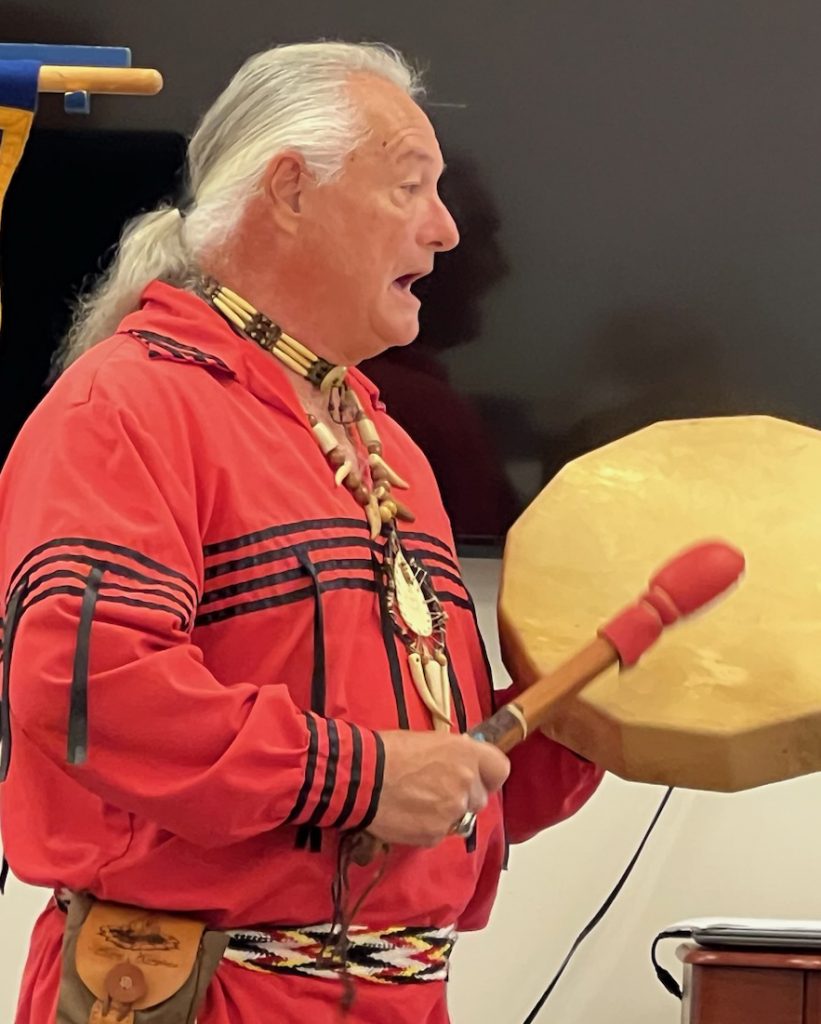 Williams explained that every Indian tribe in South Carolina has a pow wow every year with drumming, dancing and singing. During the program, he sang a song to a drum beat as it would be at a pow wow.