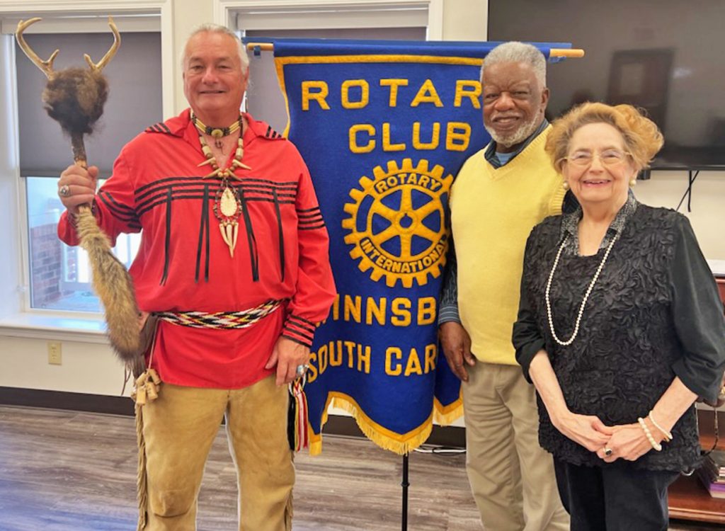 WINNSBORO – The Winnsboro Rotary Club held its first meeting of the new year on Tues., Jan. 3. Above, club president Arthur Lathan, center, welcomes Winnsboro resident, Mark Williams, left, a member of the Lower Eastern Cherokee Nation of South Carolina, to talk about his work with his tribe and tribal traditions. Williams serves as both the War Chief and the Fire Keeper for his tribe.