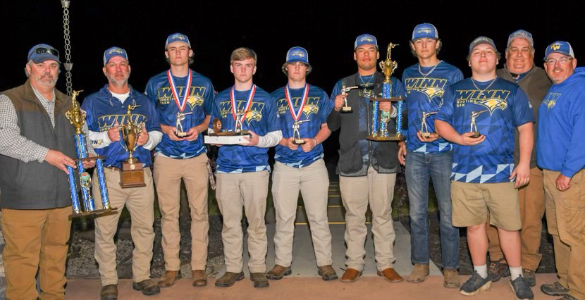 Pictured from left, Richard Winn shooting team director Scott Clyburn with the first place team of Coach Randy Wilkes, Charlie Bonds, JT Wilkes, Caleb Geddens, and third place finishers Campbell Sims, Connor Little, Ben Clowney, Coach Brian Bonds and Coach John Lewis. | Contributed