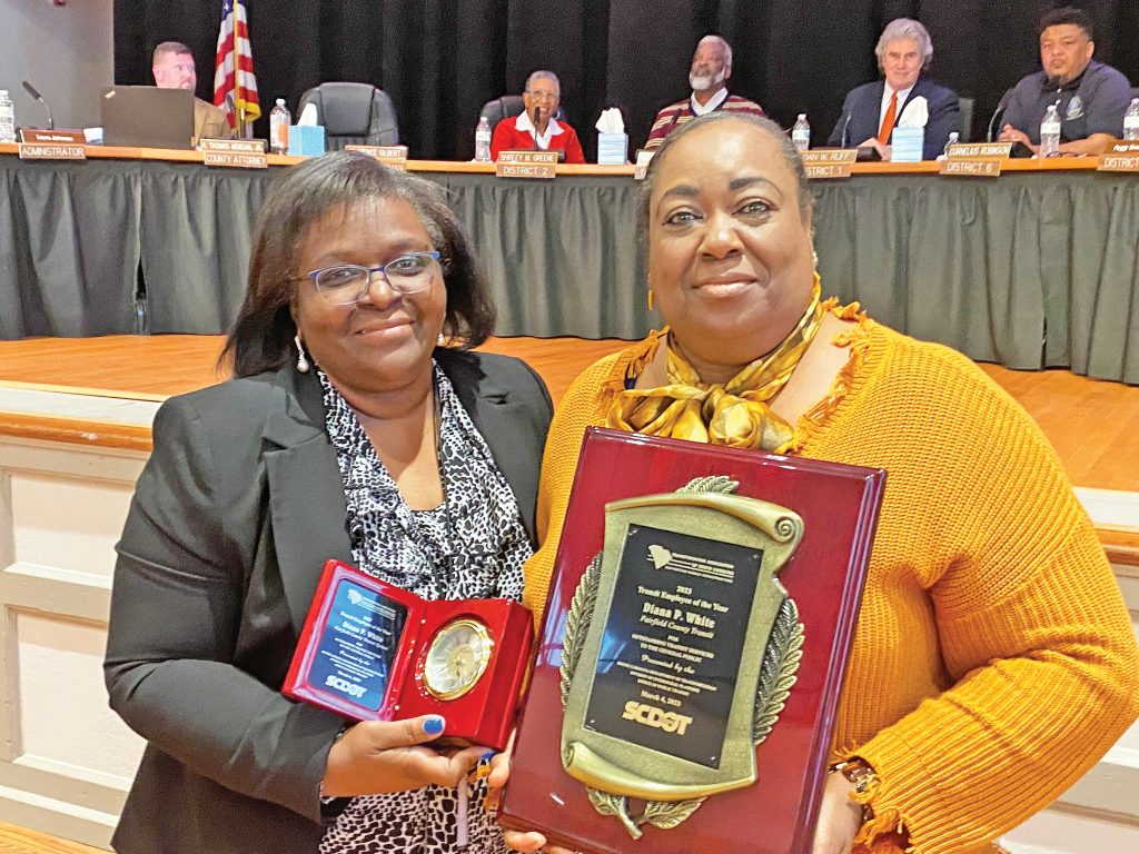 Pictured above left with Interim County Administrator Laura Johnson, left, Ms. Diana White was awarded Transit Employee of the Year for her service as the Fairfield County Transit Director.