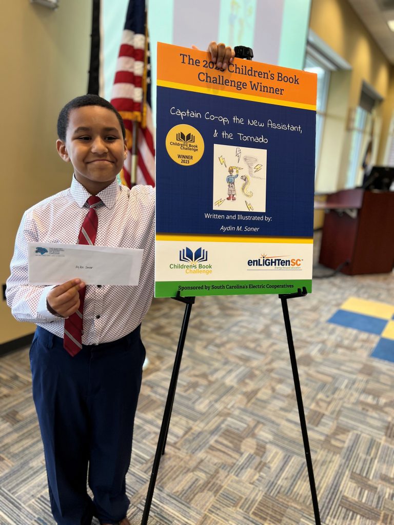 BLYTHEWOOD – Aydin Soner, the regional children’s book winner for Fairfield Electric Cooperative, was selected as one of the statewide winners of the 2023 Children’s Book Challenge for his book Captain Co-op, the New Assistant and the Tornado.