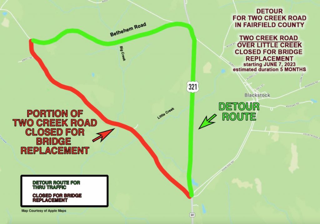 FAIRFIELD COUNTY – The South Carolina Department of Transportation is beginning construction of a bridge replacement project along Two Creek Road over Little Creek in Fairfield County, southwest of Blackstock. The bridge closed on Wednesday, June 7. Construction is anticipated to last approximately five months.