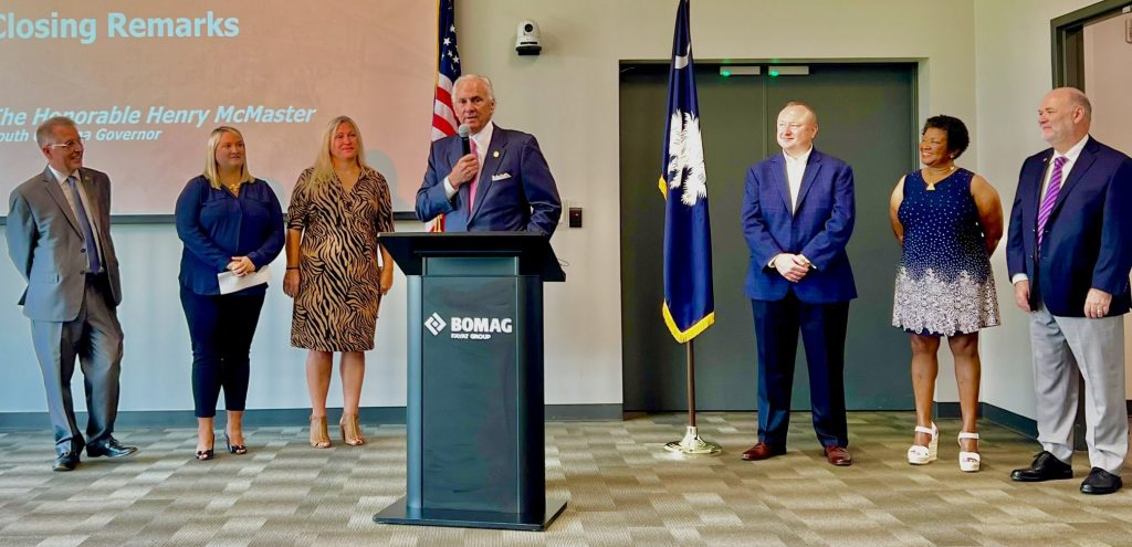 WINNSBORO – South Carolina Governor Henry McMaster, center, was on hand at BOMAG America on Tuesday for the launching of CONNEX South Carolina, a manufacturing supply chain solution connecting manufacturers, like BOMAG, to component suppliers across the state.