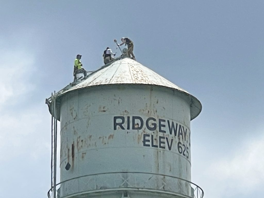 Workers clean, repair and paint the Ridgeway water tower. | Gloria Keefe