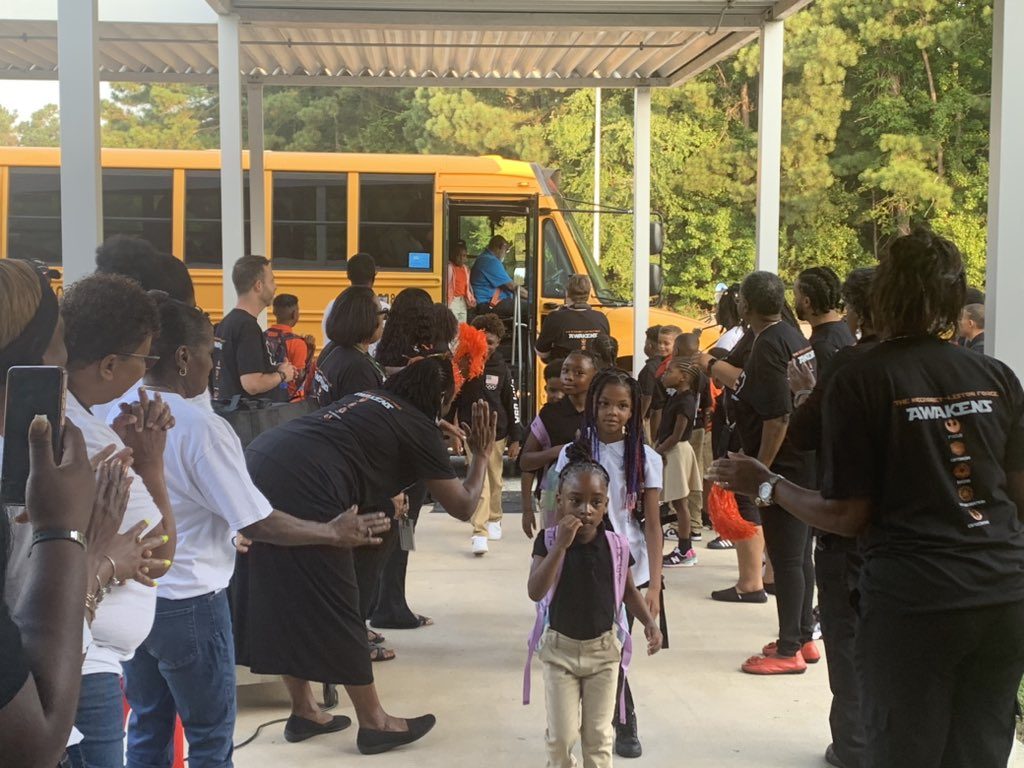 Pictured above center, students are welcomed into McCrory-Liston for the new school year. Pictured at below, students on their first day at Fairfield Magnet School.