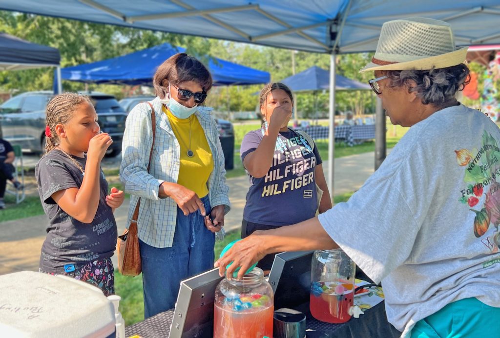 WINNSBORO – Fairfield Farmers and Artisans Market herb vendor Adele Pauling, right, provided shoppers samples of her homemade raspberry lemonade during Saturday’s market.