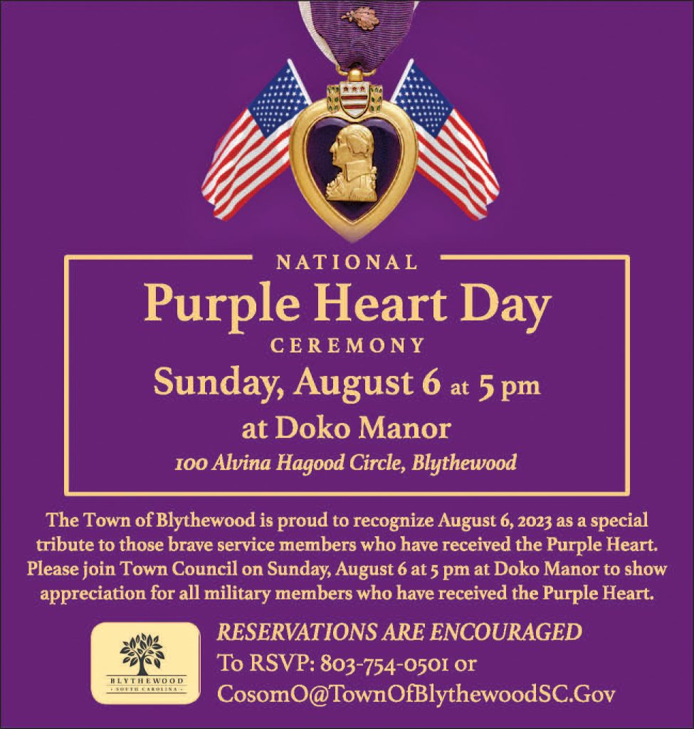BLYTHEWOOD – The Town of Blythewood will hold a National Purple Heart Day ceremony on Sunday, Aug. 6 at Doko Manor in Doko Meadows Park.