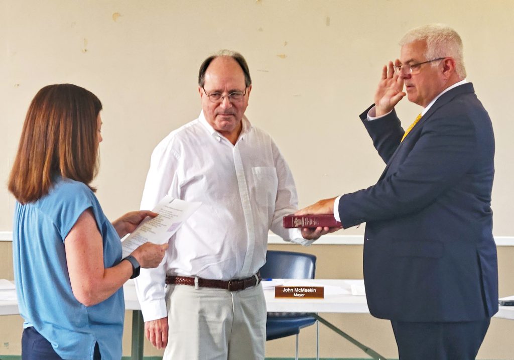 WINNSBORO – Winnsboro Municipal Court Judge William D. Robinson, III, right, was sworn in for a second term by Town Clerk Patti Davis (at right) at the Winnsboro Town Council Meeting on July 18.  Mayor John McMeekin held the Bible for the swearing in ceremony.
