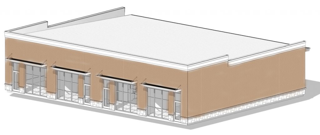 The façade and sides of the building will be brick with decorative stonework at the doorways and around the sides of the building. Each office space will feature a window that covers a large area of the front wall of each space.