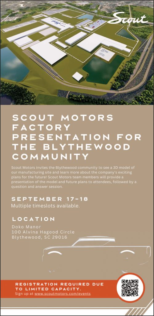 BLYTHEWOOD – A public meeting is set for Sept. 19 for members of the pubic to ask questions and learn more about the progress of the Scout Motors project in the Blythewood Industrial Park.