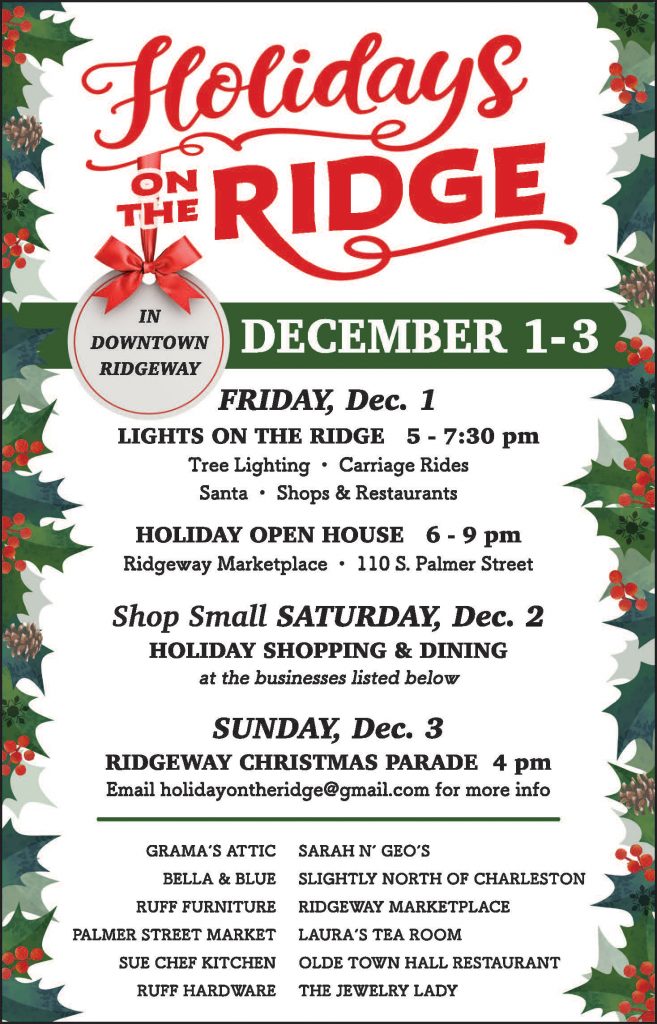 RIDGEWAY – Holidays on the Ridge will feature three days of Christmas ‘JOY’ you won’t want to miss – a tree lighting that includes Santa and free carriage rides, a full day of shopping and dining out, and the grand finale: the Ridgeway Christmas Parade.