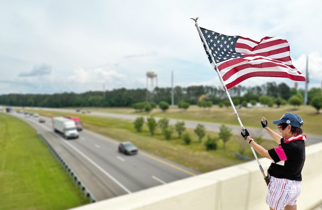 For the past 114 consecutive weeks, Nguyen and her friends have stood at the edge of the Blythewood Road bridge over I-77, waving large American flags on Fridays, during the noontime hour. Nguyen said that, during that time, over 400,000 people have seen and acknowledged the flags in some way – with honks, waves and smiles. They pass under the bridge, she said, and go on.
