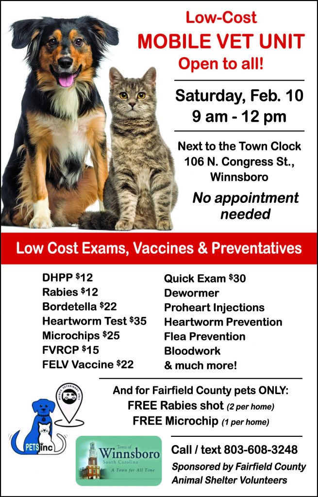 WINNSBORO – “A mobile vet clinic will be in the parking lot next to the town clock in downtown Winnsboro from 9 a.m. until 12 p.m. on Saturday, Feb. 10,” said Sonja Murphy, one of the organizers of the event. “We will be all about healthcare for dogs and cats.”