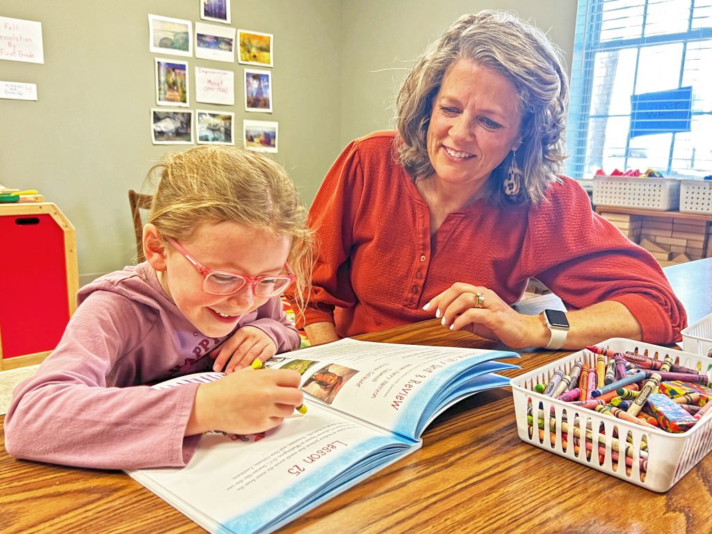 Karen Hanley, the school’s director, visits with first grader Kate Coffey, as she colors in a workbook. | Photos: Barbara Ball