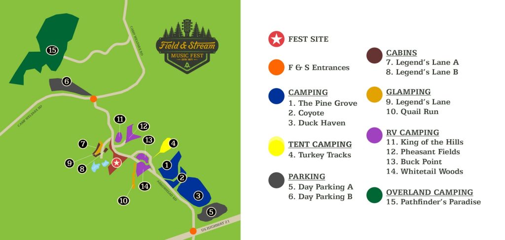 A variety of accommodations will be constructed on the festival site, including tent and car camping, RV camping, cabins, and glamping.
