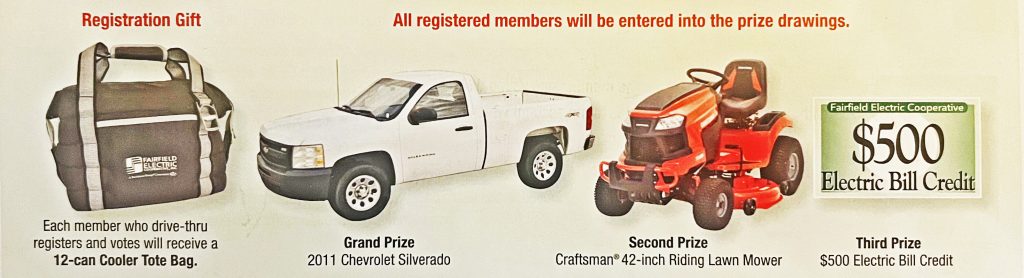 All registered members will be entered into the prize drawing which will be held at the end of the business meeting. Winners will be notified. The Grand Prize is a used 2011 Chevrolet Silverado; second prize is a Craftsman 42-inch Riding Lawn Mower; and the third prize is a $500 electric bill credit. Additional prizes will be awarded, including gift cards and electric bill credits.