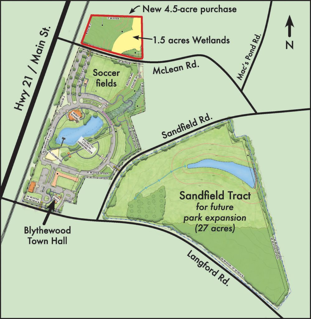 Assistant Town Manager Daniel Stines said phase two of the park improvements and expansion include not only finishing the current soccer field and adding restrooms and planning for a farmers market facility, but would also include plans and designs for the newly purchased acreages adjacent to the park – a 4.5 acre parcel across McLean Road from the park and a 27-acre parcel across Sandfield Road.