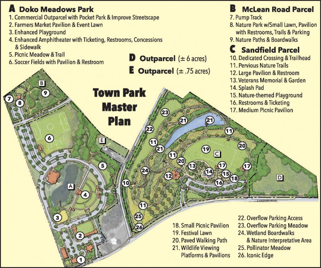 BLYTHEWOOD – The public got their first glimpse last week of a suggested master plan for the town’s park complex, consisting of: Doko Meadows Park and the town hall area; the McLean Road park property; and the newly acquired Sandfield Road property.