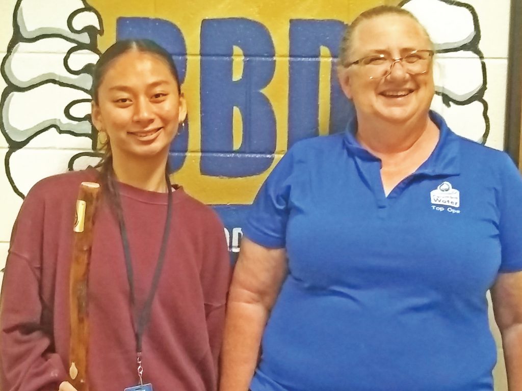 Pictured above, Jill Martinez, right, with the City of Columbia Canal Water Plant presents Rebecca with an original walking stick carved from Camp Barstow Cypress.