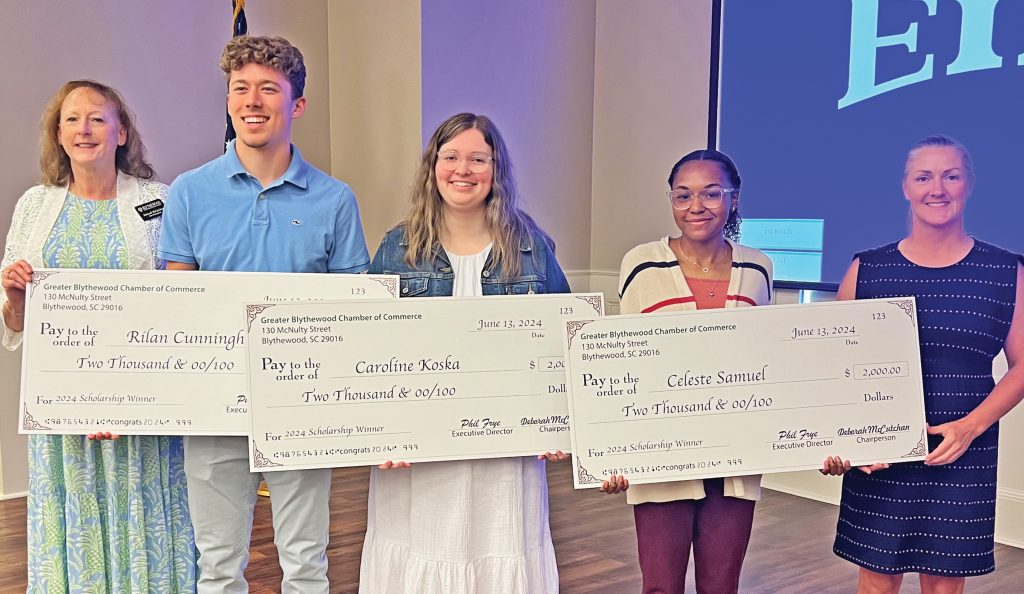 BLYTHEWOOD – The Blythewood Chamber of Commerce awarded $2,000 scholarships to three Blythewood graduates from area schools at its June breakfast meeting.