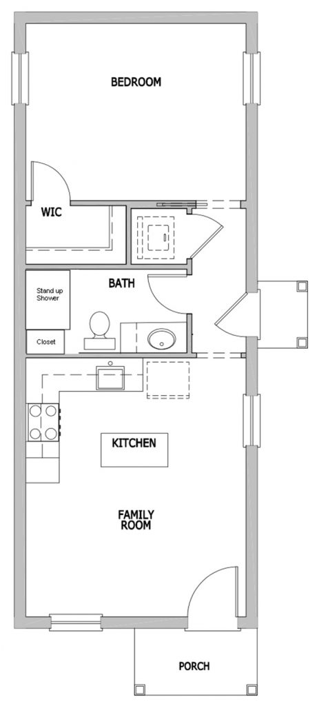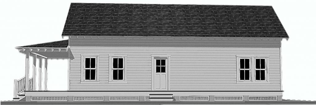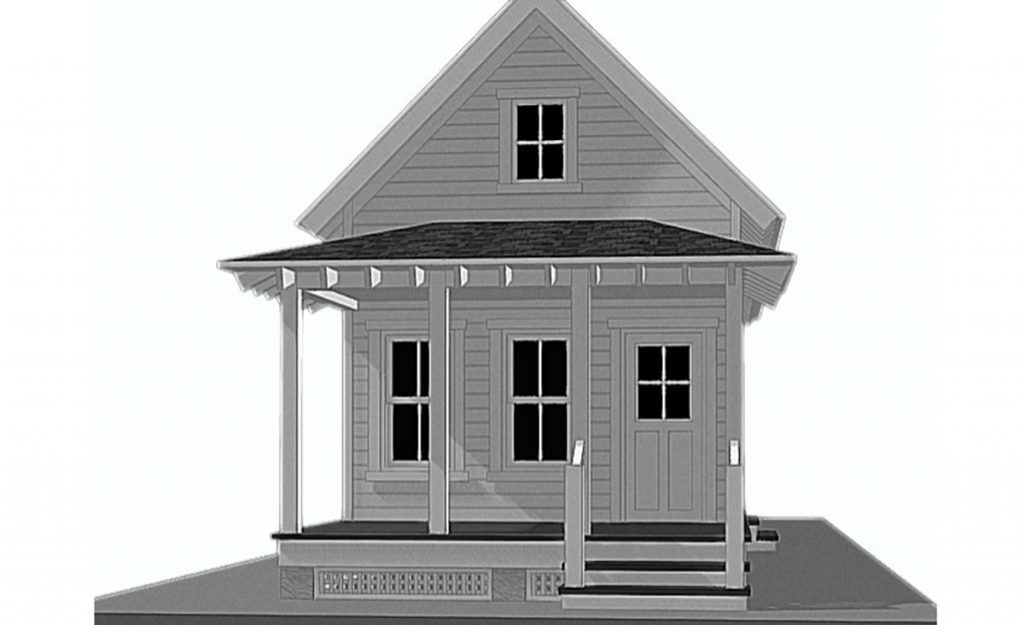 The 14’ x 36’ home will feature a covered porch across the front of the house, green metal roof, and a fully sodded front lawn. The shotgun style one-bedroom home will be connected to city water and sewer; trash pickup will be available; and it’s in walking distance of downtown restaurants, shopping, banks, government offices, and other services.