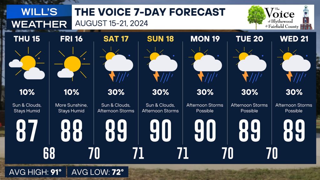BLYTHEWOOD/FAIRFIELD COUNTY – We’ve had a front draped across the Blythewood & Fairfield county areas earlier this week bringing us some widely scattered rain and storms. That front has pushed south and out of the area being replaced by high pressure. High pressure should keep us dry to end the work week. I have left in a 10% chance of showers both Thursday and Friday just in case a shower or storm tries to pop up during the heat of the day. However, I think the ridge in place is strong enough to keep us rain free, but humidity sticks around.