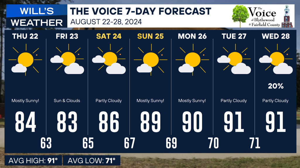 Wednesday: Mostly Sunny. A slight chance of a shower or thunderstorm. High near 91. Chance of rain is 20%. Winds out of the southeast, shifting southwest at 5-10 mph.