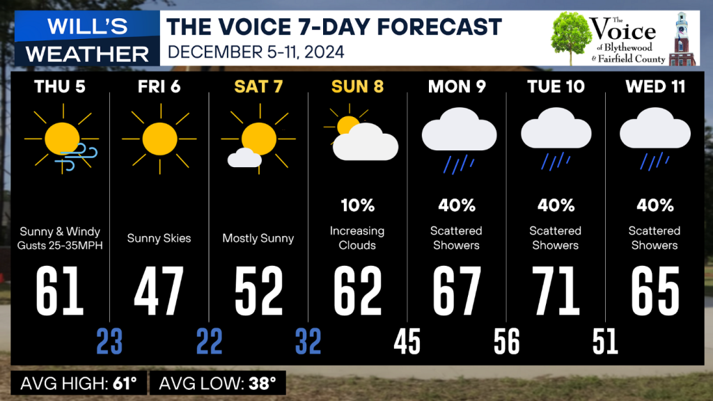 A strong upper-level trough will drive a cold front through the Blythewood/Fairfield County area Thursday afternoon, bringing breezy conditions with wind gusts of 25–35 mph. Afternoon temperatures will reach the 60s before dropping sharply into the low 20s overnight. The cold front will maintain dry, cool weather through Friday and Saturday, with daytime highs in the upper 40s to low 50s and overnight lows in the 20s.