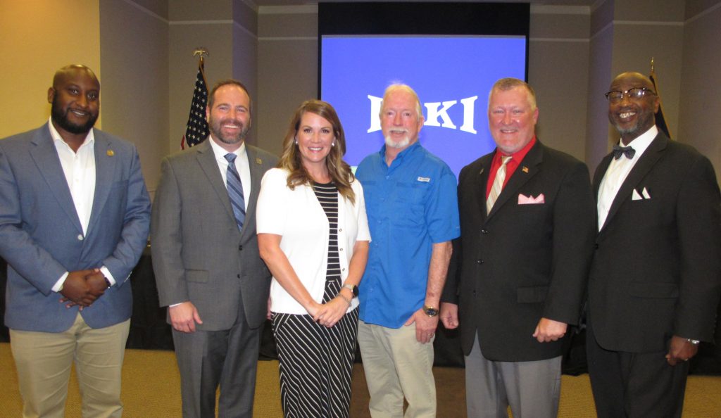 In June, 2021, newly hired Ashley Hunter, owner and CEO of MPA Strategies, announced a $10K International Paper Company grant to the Town. Shown here are, from left: Councilmen Sloan Griffin, Donald Brock, Hunter, Eddie Baughman, Mayor Bryan Franklin and then-Councilman Larry Griffin. Less than a month later, council voted 3-1 to terminate her contract with the Town. | Barbara Ball