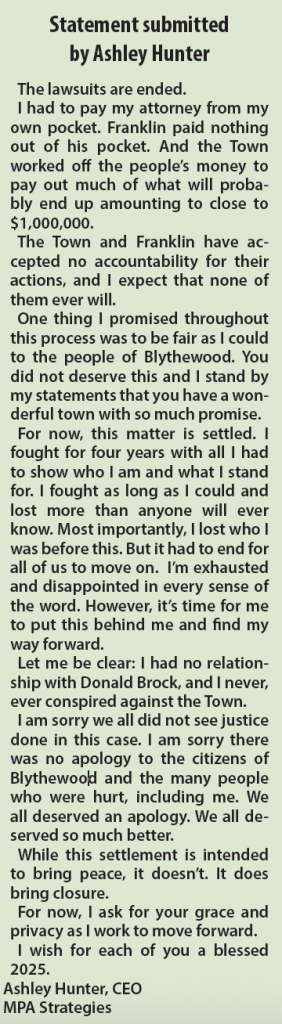 The settlement included a further stipulation that the Town of Blythewood re-issue (to Hunter) a check in the amount of $6,400, which had been tendered to MPA Strategies, LLC in August of 2021, for work Hunter had performed for the Town. That check was never negotiated because the Town placed it into escrow after it abruptly terminated Hunter’s contract on Aug. 28, 2021, in violation of the contract’s stipulations, according to Hunter’s attorney Paul Porter with Cromer, Babb, and Porter law firm. After a year in escrow, the original check was no longer negotiable.